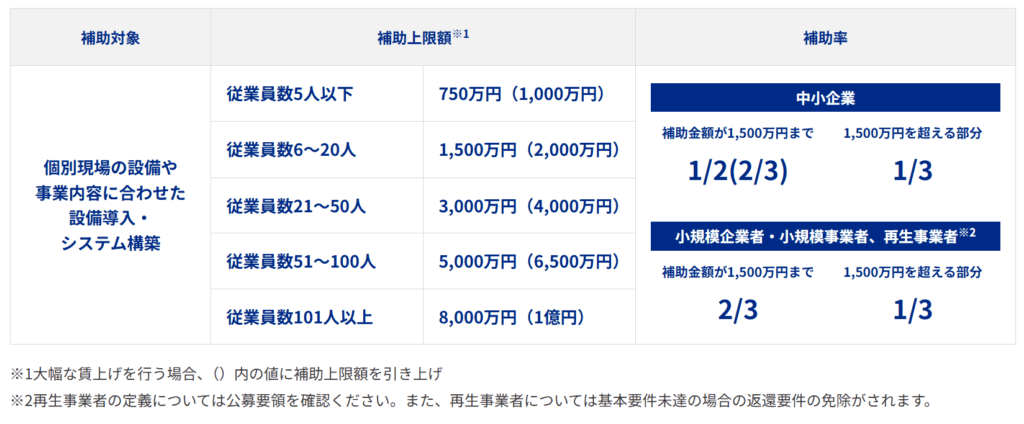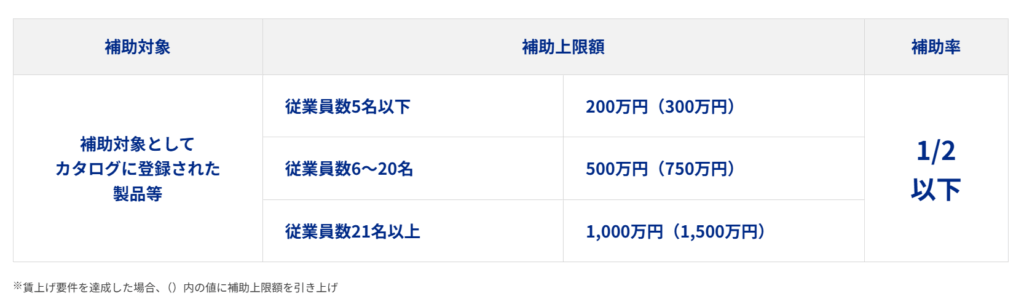 | 補助率等 | カタログに掲載された製品が補助対象となります。また、補助上限額は従業員数ごとに異なります。 |