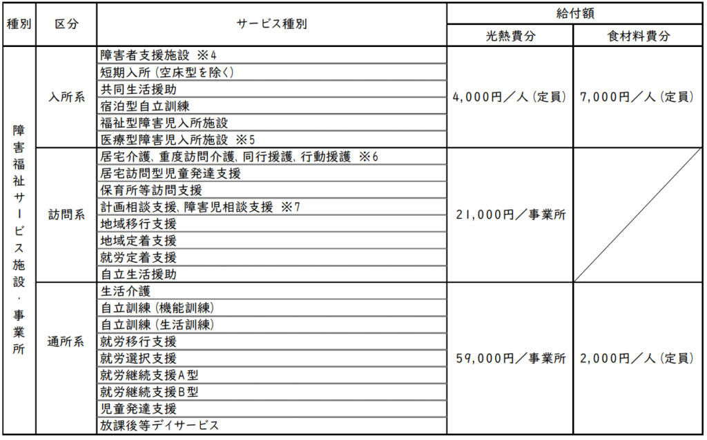 障害福祉施設・障害福祉サービス事業所(以下、「施設等」といいます。)に対して、エネルギー等物価高騰に係る支援金を支給することで、負担軽減を図ります。