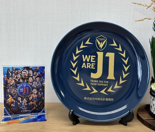 2025年シーズン、8年ぶりのJ1昇格という大きな節目を迎えられ、パートナー企業へのお礼として昇格記念品「ミニシャーレ(飾り皿)」を頂きました。